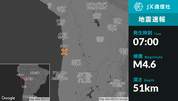 | 震源地 | チリのIquiqueから南103kmの地点 |