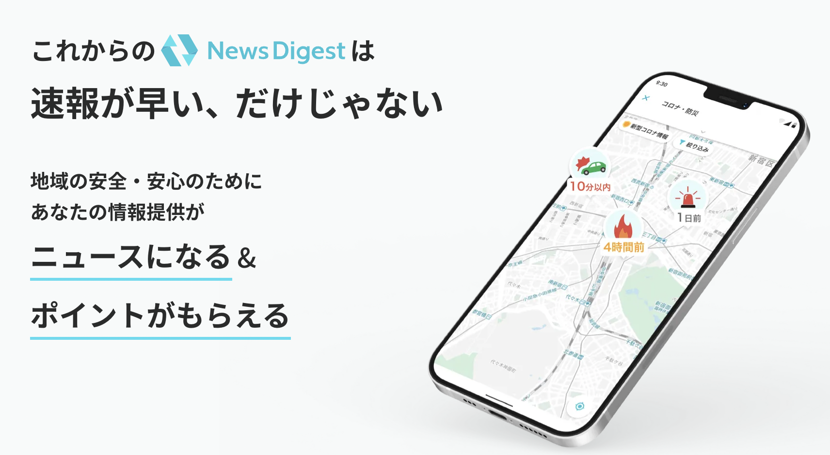 提供された情報はNewsDigestの“コロナ・防災マップ“で共有され、地域の皆さんで「いつ・どこで・何が」起こっているのかを把握することができます。