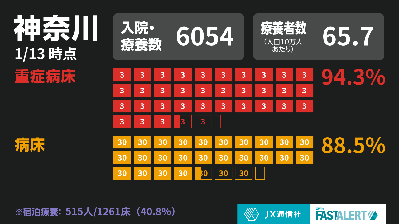 病床別では、重症者用病床は106床のうち100床が埋まり、使用率は94.3%(同93.9%)、軽症や中等症用の病床は826床のうち731床が埋まり、使用率は88.5%(同88%)となっている。(JX通信社/FASTALERT)