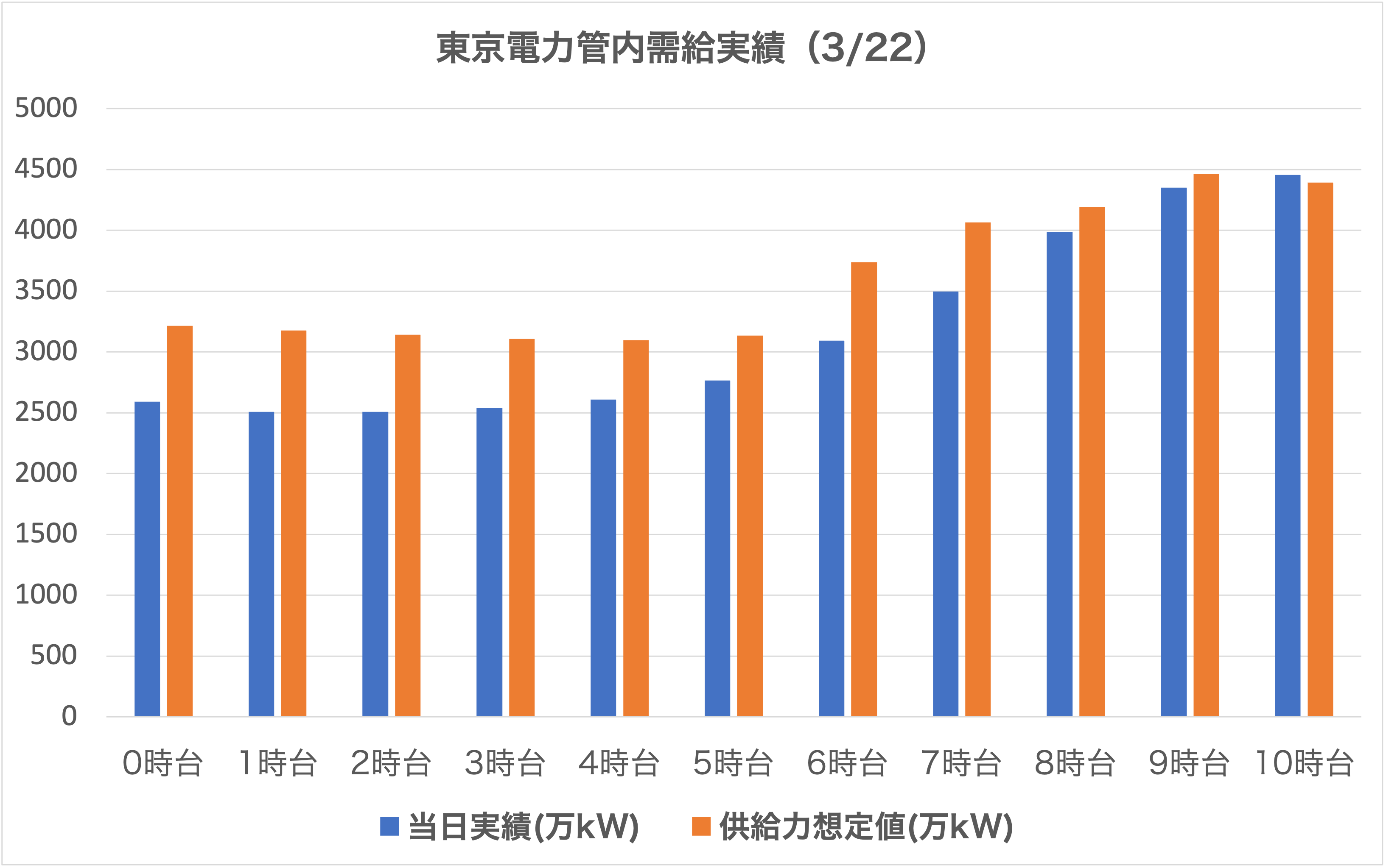 需給ひっ迫のピークは16時台と予想され、東京電力管内と東北電力管内に政府から初の「電力需給ひっ迫警報」が発表されている。